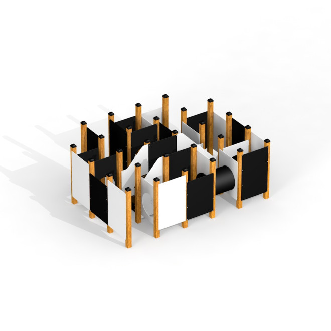 Ce labyrinthe est fabriqué avec soin à partir de bois de mélèze, reconnu pour sa robustesse et sa durabilité face aux conditions extérieures. Les panneaux en HPL (stratifié haute pression) apportent une finition résistante aux intempéries et aux rayures, tandis que les éléments en PE (polyéthylène) garantissent une surface lisse et sécurisée pour les enfants.
