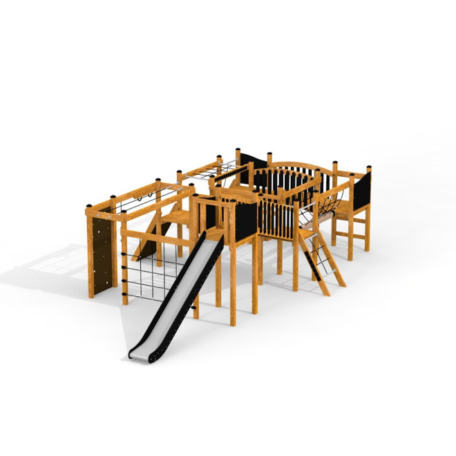 Cette structure est réalisée avec des matériaux de haute qualité soigneusement sélectionnés : bois de mélèze robuste, acier inoxydable et acier galvanisé pour une durabilité optimale, ainsi que des éléments en HDPE recyclé. Les cordes en polypropylène renforcé et souple garantissent une sécurité maximale tout en offrant une prise confortable. Le contreplaqué antidérapant et imperméable assure une surface stable et sécurisée, complétée par des composants en PE pour une résistance accrue aux intempéries.