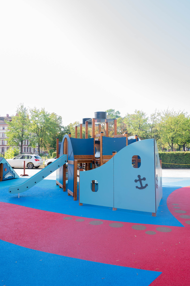 Steamboat s'intègre parfaitement dans les aires de jeux publiques ou privées, favorisant l'interaction sociale, la motricité et la créativité. Son design attrayant et ses multiples zones de jeu encouragent les enfants à grimper, glisser, ramper et imaginer des aventures maritimes passionnantes, enrichissant ainsi leur expérience ludique.