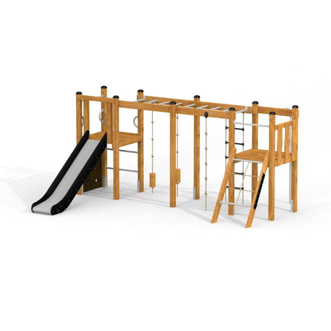 Idéal pour les espaces extérieurs modernes, ce module de jeu encourage le développement moteur et social des enfants. Sa conception polyvalente s’intègre harmonieusement dans les jardins, les écoles ou les parcs, offrant un lieu stimulant où petits et grands peuvent partager des moments de plaisir et d’activité physique.